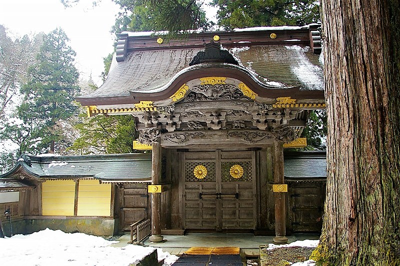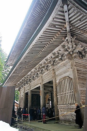 ![]() 唐門は「勅使門」とも呼ばれ、扉の中央には金色の菊の御紋が施されている。 皇室からの使者を迎えたり貫首が赴任したりする時以外は開かない。 |