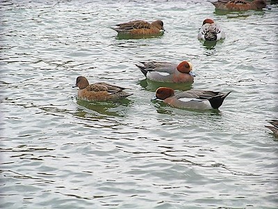 ![]() いろいろな鴨が群がる |