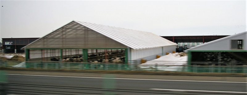 ![]() 道央自動車道脇に隣接の牛舎(白と黒は乳牛・黒い牛は食肉だそうです) |