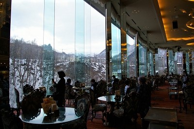 ![]() ![]() 雪景色を見ながらのバイキング会場は驚くほど広い(70mあろうか) |