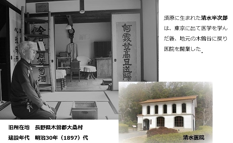 ![]() 木曽路の中程、妻籠と木曽福島の中間、須原の地にこの清水医院は建てられた。 |
