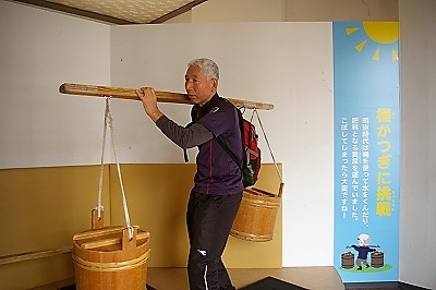 ![]() 天秤棒はバランスが難しく、肩にずっしり重さが・・・! |