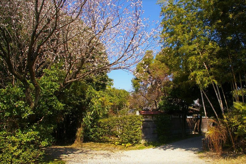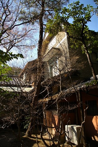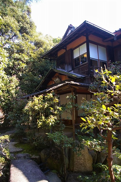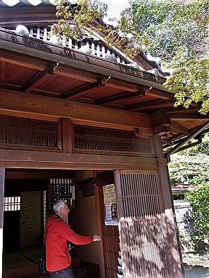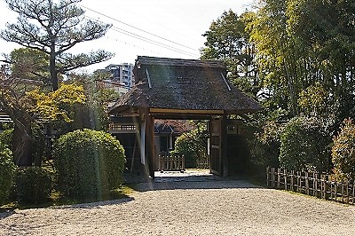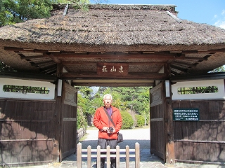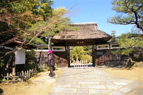 ![]() 東山荘 茅葺の門と銅板葺の塀が落ち着いた景観 |