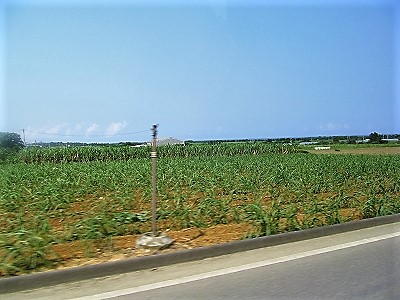 サトウキビ畑(機械で刈り取ればまた新芽が伸びる)にパイナップル畑(水はけのよい傾斜に作付け)が続く