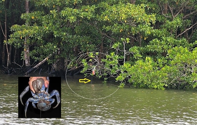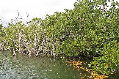 ![]() 川面の黄色い葉はマングローブの葉がわざわざ塩分をたくさん吸って落ちた葉です(噛むと塩っ辛い) |