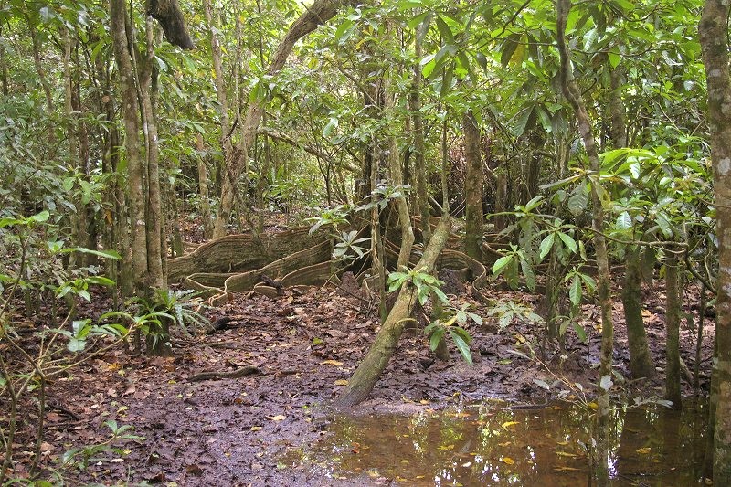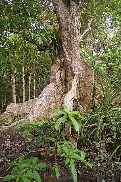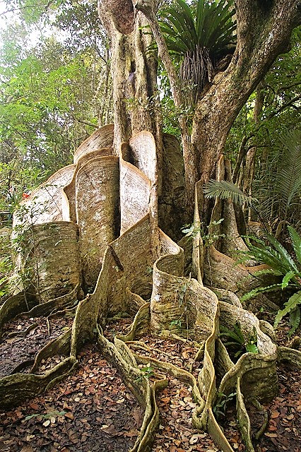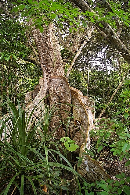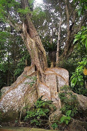 ![]() スオウノキの特徴は「板根」に見られる。 蛇がうねっているようで不気味な姿。 |