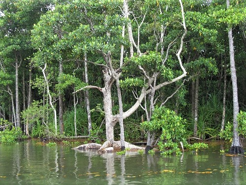 ![]() 満潮時のマングローブが 日本には、ヤエヤマヒルギ、オヒルギ、メヒルギ、 ヒルギモドキ、ヒルギダマシ、マヤプシキ、ニッパヤシの7種類 |