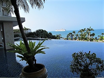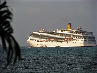 ![]() 港沖には台湾の豪華客船が停泊 |