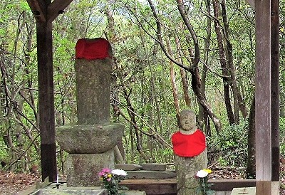 ![]() 『首なし地蔵跡』 パンの耳(砂糖をまぶした)を食べながら休憩タイム! 誰かが忘れた帽子をかぶせる? |