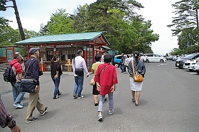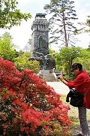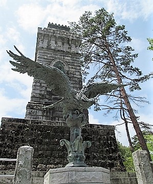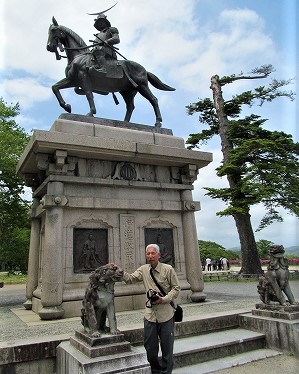 ![]() 伊達政宗像と慰霊塔(上段から地震で落ちた鳥像) |