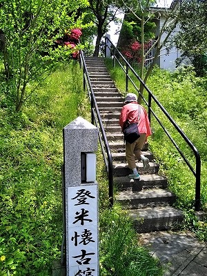 ![]() 『教育資料館』 スリッパに履き替え、雨で濡れた正面2階バルコニーで滑り、ねん挫しそうに! 管理者の怠慢ですね! |