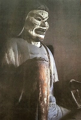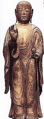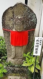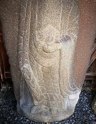 ![]() 『見返り地蔵』 錫杖を持ち後方を振り返り、慈悲にあふれた衆生済度の歩行中の姿である。 足はそろっていない! |