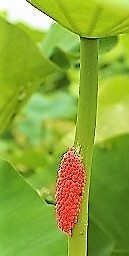![]() 茎に付いたピンクの卵は外来種スクミリンゴガイ(ジャンボタニシ) 稲・レンコン・イグサ等の水田作物を食害する。 |