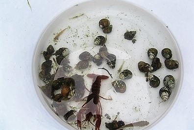 ![]() ヨシを刈り取った後にカラスが舞い降り、豊富なザリガニなどのバイキングです。 |