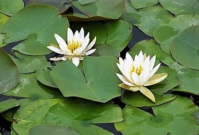 ![]() シロツメグサの群生奥にスイレンが花開く |