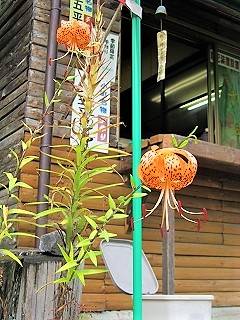 ![]() 鬼百合に迎えられ! 五平餅の板も間伐材から鉈による手作りです |