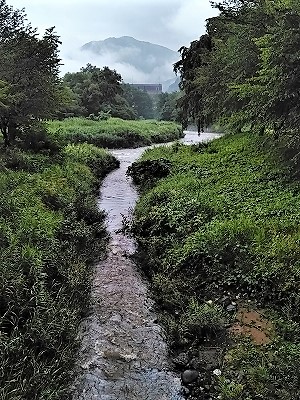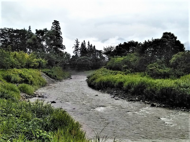 ![]() 17:45 長野県北安曇郡白馬村にある大出の吊橋。 白馬岳がかろうじて頭を出しています。 |