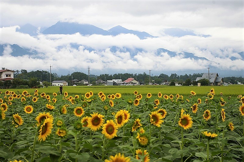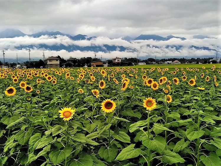 ![]() 初日に見られなかった飛騨山脈が、最終日にもう一度立ち寄ったハイジの里から向日葵と共に見られラッキーでした。 |