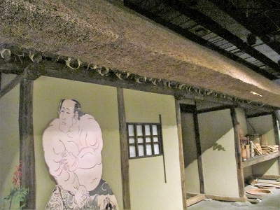 ![]() 左)30kの肥え桶を担いでみた・・・館内を新人職員さんに説明していたので少しついて回る 右)江戸時代前期の中農農家の外観を復元。実際の農家家屋が移築展示(大きすぎるので一部分) |
