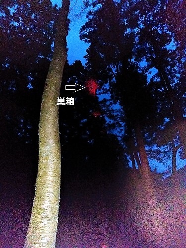 ![]() 陽が落ちたので昨日の巣箱を赤外線ライトで・・・すると顔が出てきて隣の木まで滑空する姿が見えました |