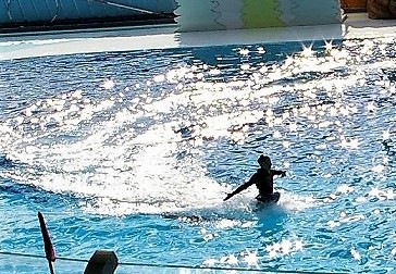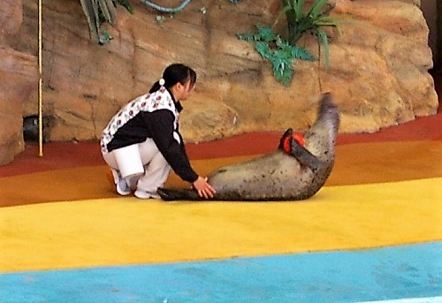 ![]() 一番驚いた芸はアザラシが腹筋の後お腹に持ったフルスビーを、口にくわえ後方に高速で投げた事! |