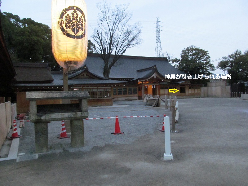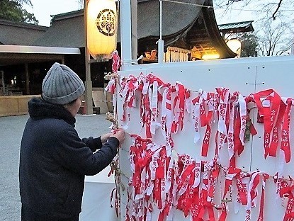 ![]() 国府宮はだか祭りは愛知県稲沢市に鎮座する尾張大国霊神社(国府宮)に伝わる儺追神事(なおいしんじ)の通称。 神男と呼ばれる一人の儺負人(なおいにん)に厄災や穢れを負わせ、それらを土餅(どべい)と呼ばれる餅に移して土の中に埋め、厄を落とす。 |