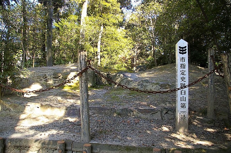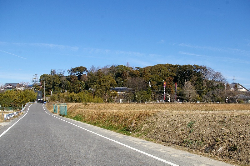 ![]() 城跡の以前は古墳であっただろう! 正面の森が白山神社 古墳跡が見られます。 |