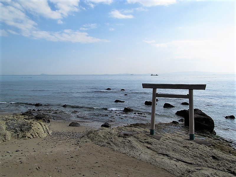 ![]() 『つぶて浦鳥居』 南知多町に建つ 神代のむかし、伊勢の朝熊山に集まった神々が、力比べをすることになり。伊勢湾を隔てた知多半島まで、いちばん大きな岩を遠くまで 投げたものが勝ちということにして、山の岩を投げた。神々は力いっぱい投げた。勢いよく飛んできた岩が、今のつぶて浦の岩になった |