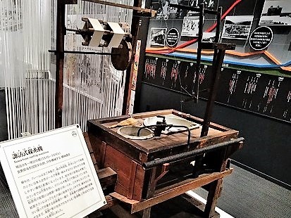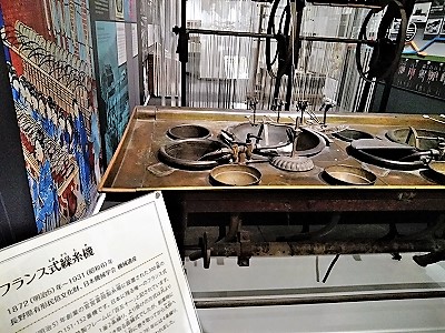 ![]() 左)明治5年の官営富岡製糸場で稼動し、唯一残されているフランス式繰糸機 右)武居代次郎が開発した諏訪式繰糸機 |