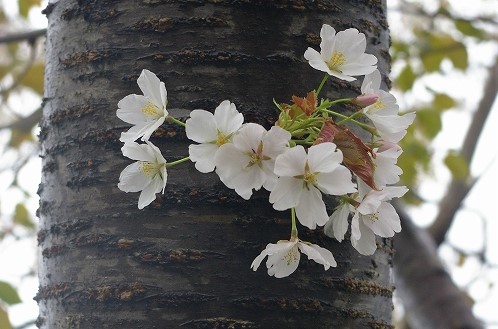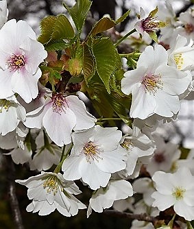 ![]() 左)今回のオオシマ桜(良く分からず撮影?) 右)オオシマ桜(検索から引用) 名前のとおり伊豆七島、伊豆半島及び房総半島を原産とするサクラ。花と葉に香りがあることや花が大きいことが特徴。 花と葉を同時に咲かせ、若葉が緑色で花が色白なのが特徴。桜餅を包むのによく用いられるそうです。 |
