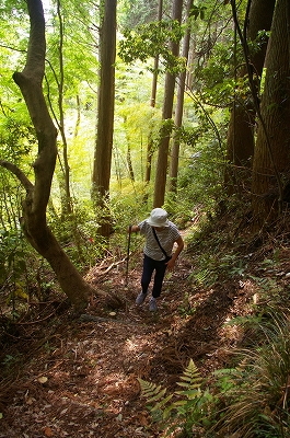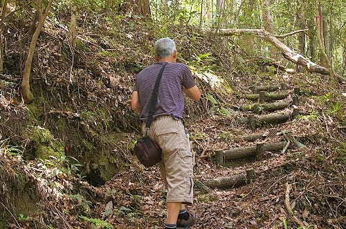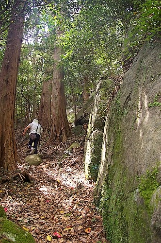 ![]() 足場が悪く滑りやすいので、枯れ枝を杖代わりに歩いています。 |