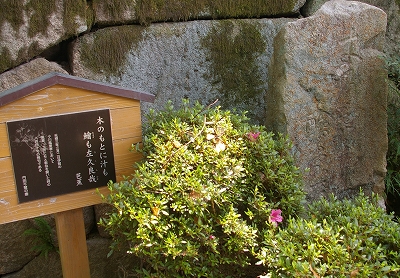 ![]() 木のもとに汁も膾も桜かな (松尾芭蕉) (きのもとに しるもなますも さくらかな) 元禄3年(1690年)3月2日、47歳。 伊賀上野の風麦亭での花見。風麦(ふうばく)は、芭蕉の故郷伊賀の藤堂 どうしてここに句碑が? |