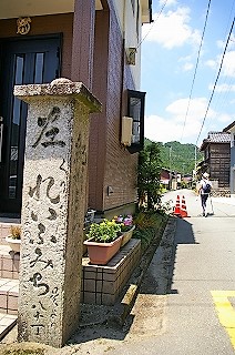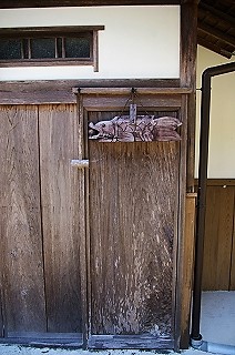 ![]() 左)民家に珍しい木魚と木槌がぶら下がる 右)霊符山への道標を左に見て宮前宿を進む |