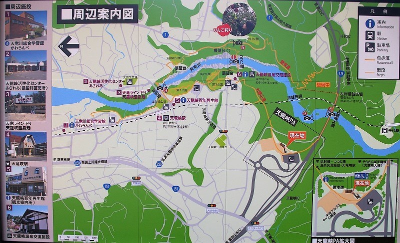 8:45自宅>R153>飯田山本IC>三遠南信道(無料)>12:15〜2:30天竜峡PA130k>徒歩=そらさんぽ天龍峡>5:45自宅260k
