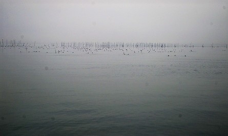 ![]() 日本水遺産 琵琶湖の伝統魚法『おいさで漁』の杭が見えます 霧で霞んでいた島がようやく見えてきました |
