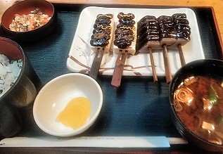 ![]() 菜めし田楽定食¥900( 盛田の小鈴ヶ谷工場で作っている盛田の名物「豆味噌」を使用。 +五平餅を二人で分け合う! |