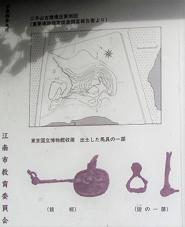 ![]() この古墳の規模は全長約60で後円部の直径35m、高さ7mあり、前方部の幅52m。高さ4mで西北を向いています。 明治二十年頃、考古学者の柴田常恵氏は「東京人類学会誌」に「この古墳は二子塚、または弁慶塚とよび、周囲はすべて水田に囲まれており堀はないようである。村人に聞くと、 先年まで一個の円塚(墳)が二子塚の右35m離れたところにあったが今は破壊されて無い、かっては左にも円塚(墳)らしい畑が残り、たぶん倍塚であろう。」と述べています。 |