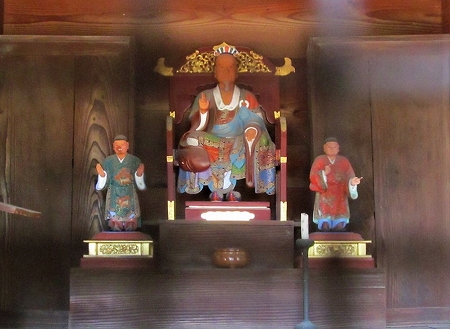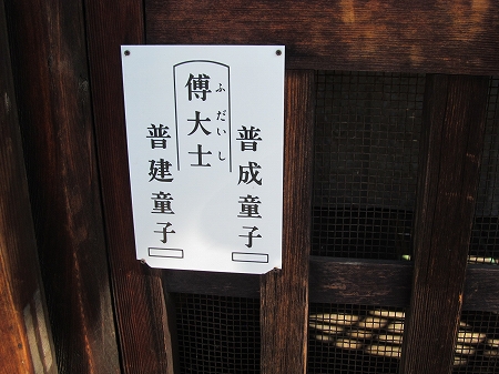 ![]() 上の写真)鐘楼の左に建つ六角堂内 傅大士は中国南朝の僧で、輪蔵の制を創設したことにより輪蔵の正面にこの像と二童子像が置かれる。 |