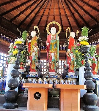 ![]() 『本堂』 本尊は聖観音。高さ一尺一寸五分の秘仏であり、本堂に安置される十一面観音像(50年に1回開帳の秘仏)の胎内仏である。 聖観音像は、釈尊の授記を受けて作られ、信州の善光寺の本尊と共に百済をへて日本へ渡り、585年に海中に投じられた三蔵仏の内の一尊といわれます。 |