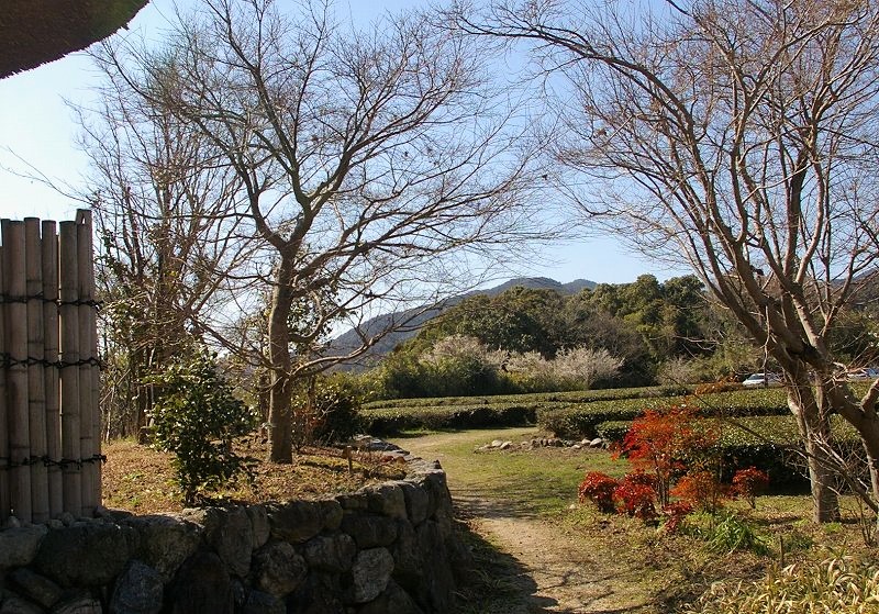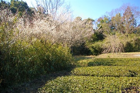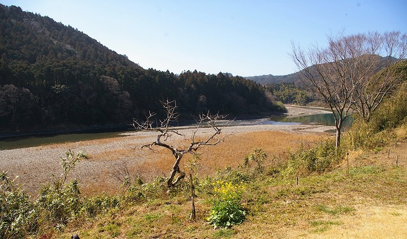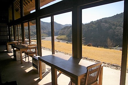 ![]() 川の崖地へ乗り出すようにに配された店内、茶畑の向こうがPです。 |