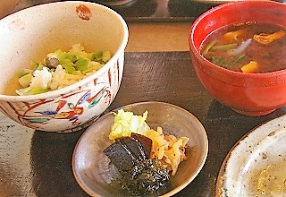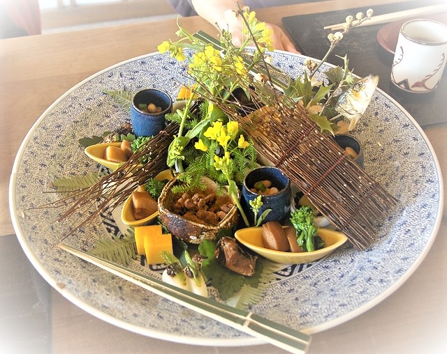 ![]() 料理は、懐石を基に地場の野菜、山菜、伊勢湾の前浜の魚を主とした料理で里山の風や季節の移ろいが散りばめられていました。 |