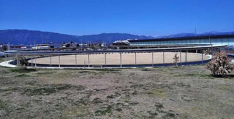 ![]() 12:00〜1:00 岐阜県『道の駅パレットピアおおの』 円形の屋根付きスロープの内側は芝生です |