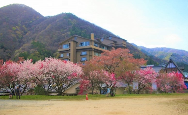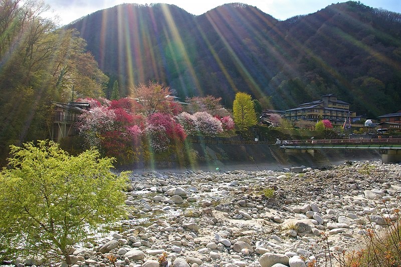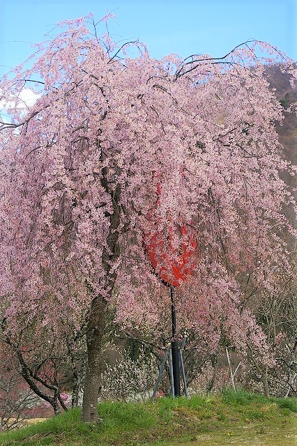 ![]() 湯の看板にシャワーのような枝垂れ桜 |