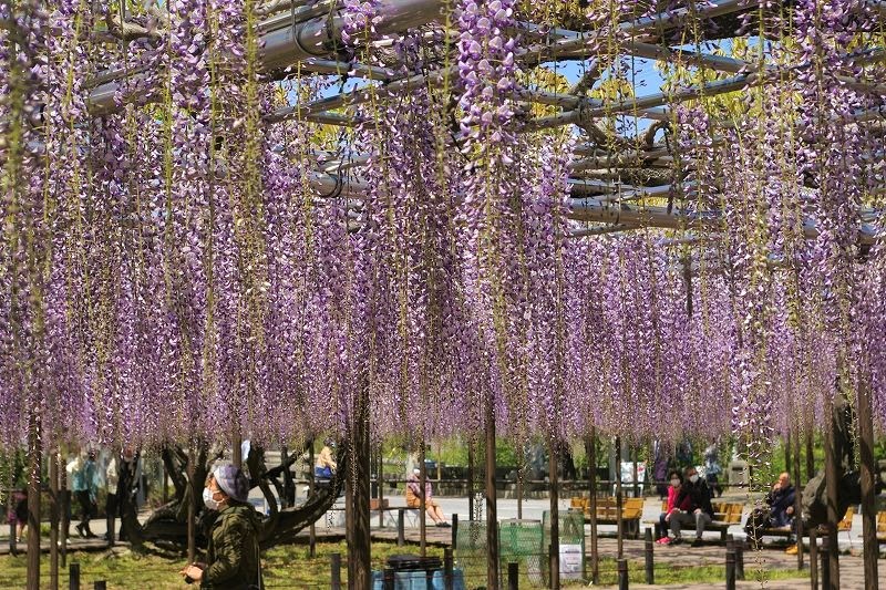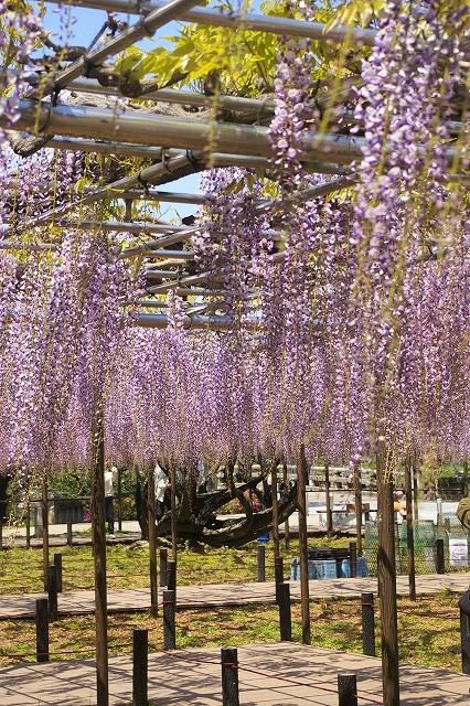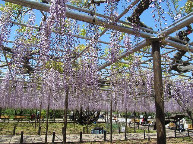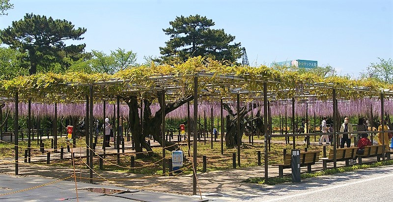 ![]() 岡崎公園南側の乙川堤防沿い(康生町)に、1300平方メートルの藤棚があり、花房が長く、見事な紫色の花が広がります。 |