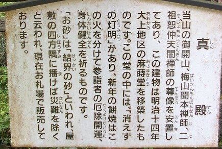 ![]() 左の堂は僧堂、右の堂が『消えずの燈明』がある真殿(外からは見えません) 『結界の砂』は社務所で・・・ 開山以来消えたこのない「灯明」があり、この火を元火にして餅を焼く「餅焼き」が行われます。この餅を食べるとその年を無病息災で過ごせるといわれています。 |