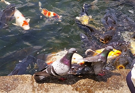![]() 鯉の餌にも恐れず近づいてくる鳩 |