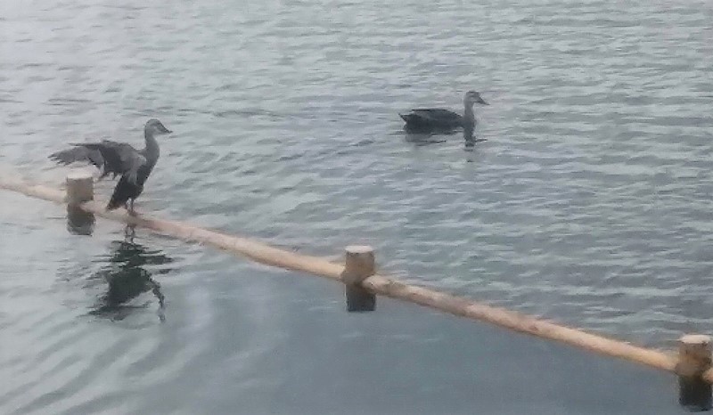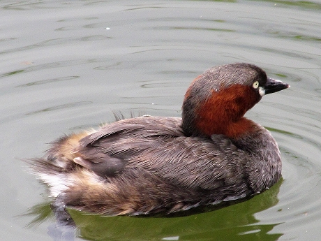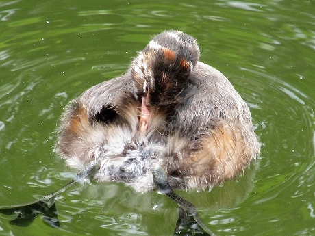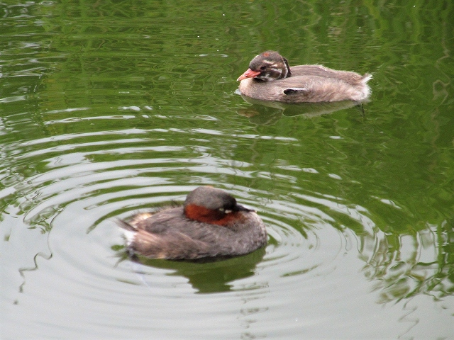 ![]() 左が親で右が子供かな(大きいです)? 小さいうちは親鳥が背中に乗せて保温や外敵からの保護を行い、雛を背中に乗せたまま潜水することもある。 |