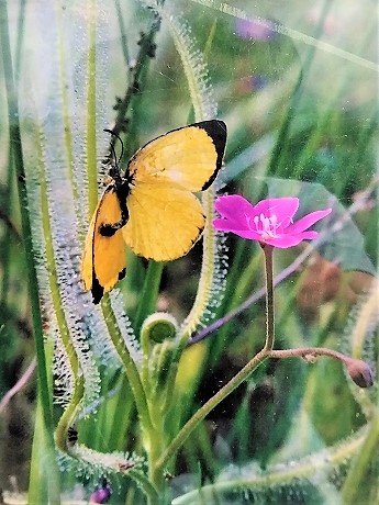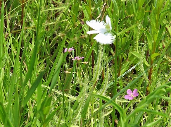 ![]() モウセンゴケ科の食虫植物で、葉の表面にある腺毛から甘い匂いの粘液を分泌して昆虫を捕らえる。 |