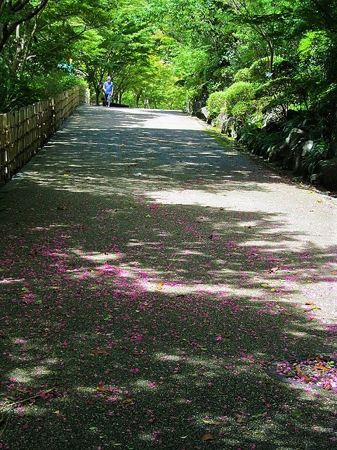 ![]() 木漏れ日を浴びながら歩くと、強風で落ちたか百日紅のピンクの花絨毯が! |