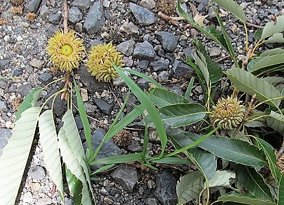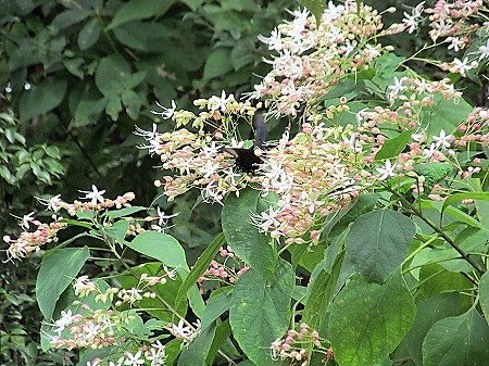 ![]() 足元には強風で枝ごと落ちたどんぐりの実 ハシドイの花にクロアゲハ |